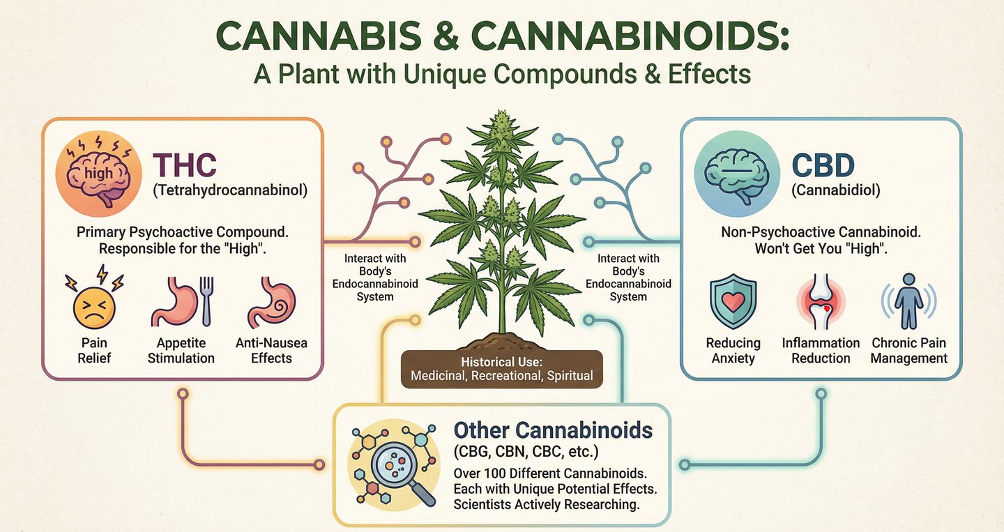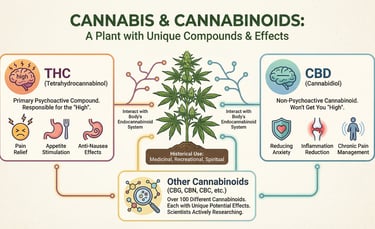 Cannabis is a plant with a rich history, used for centuries for medicinal, recreational, and spiritual purposes. It contains unique compounds called cannabinoids, the most well-known being THC (tetrahydrocannabinol) and CBD (cannabidiol), which interact with our body's endocannabinoid system.