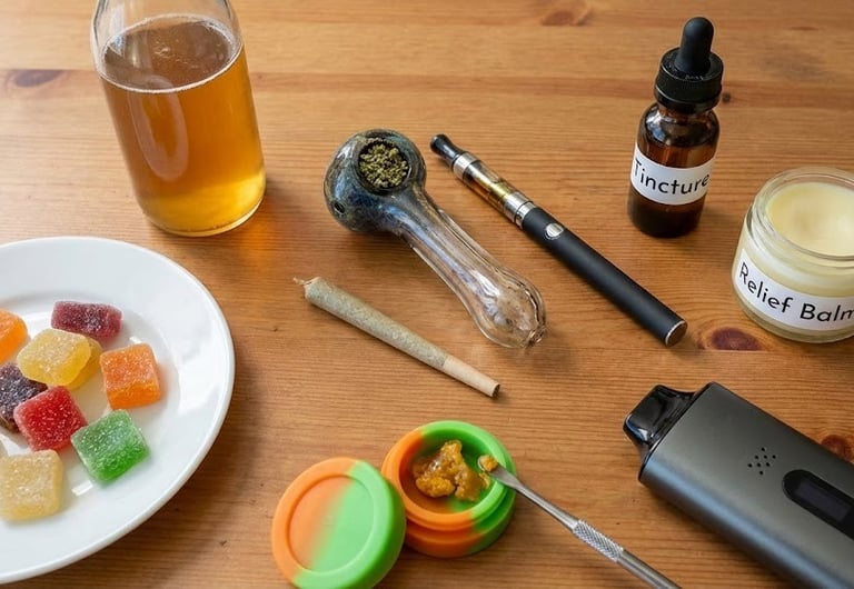 Edibles (infused foods/drinks) have a slower onset (30 mins - 2 hours) but deliver longer, more intense effects (4-8+ hours). Always "Start Low, Go Slow" with edibles.