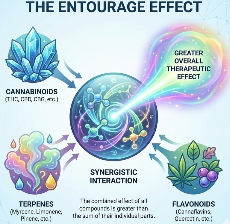 The Entourage Effect: Beyond just Indica/Sativa, the unique combination of cannabinoids, terpenes (aromatic compounds), and flavonoids in each strain works synergistically to produce its overall effects. This concept is known as the "Entourage Effect."